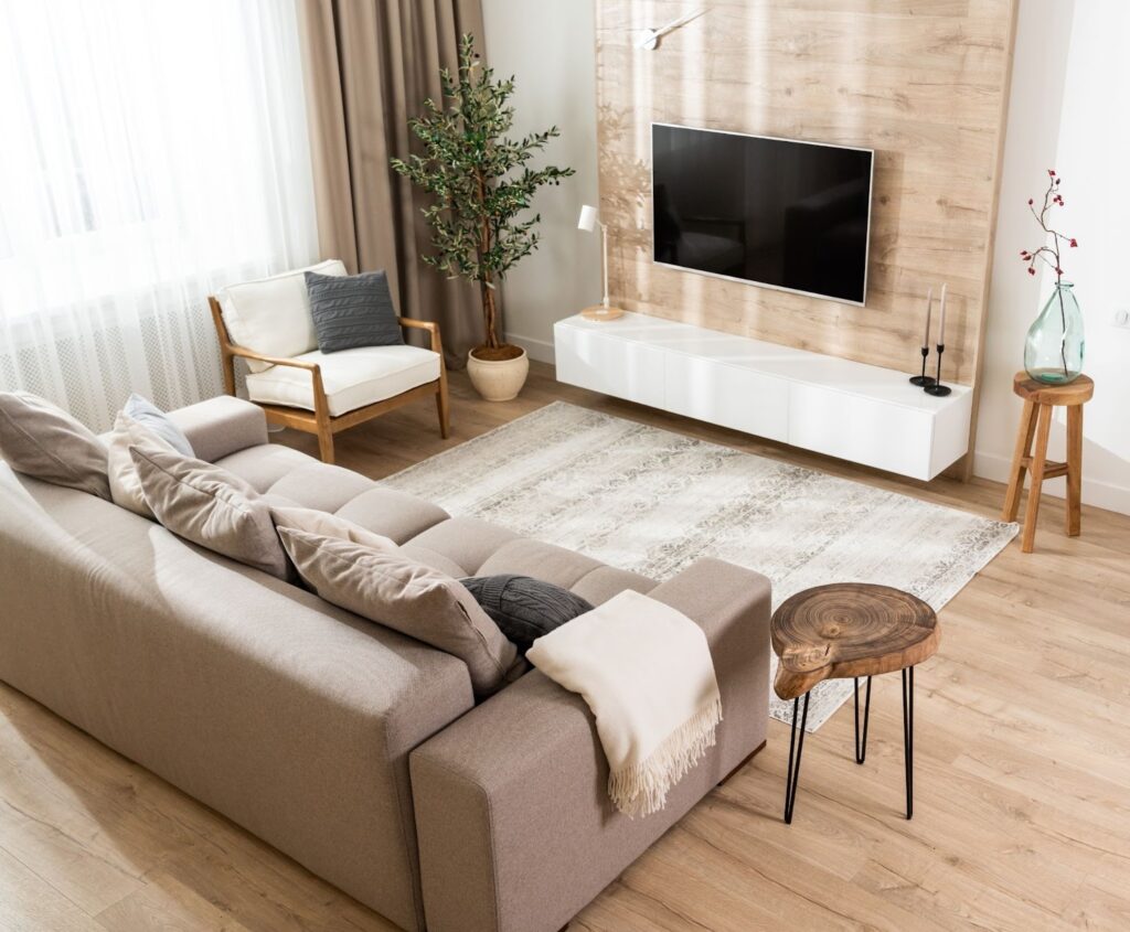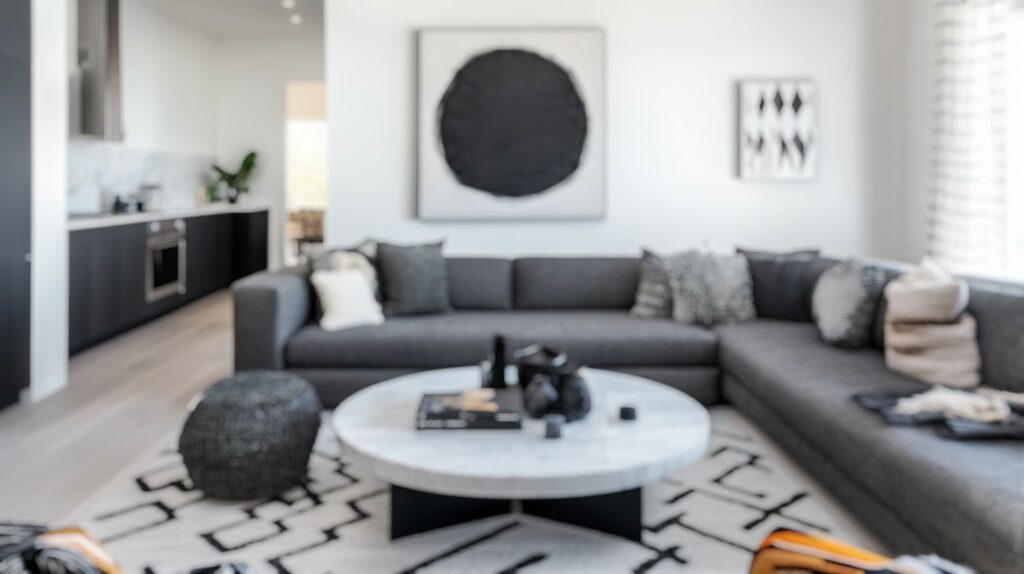 - Warm beige + cool gray + pale wood: Creates a grounded yet airy atmosphere. Perfect for living rooms where natural light shifts throughout the day.