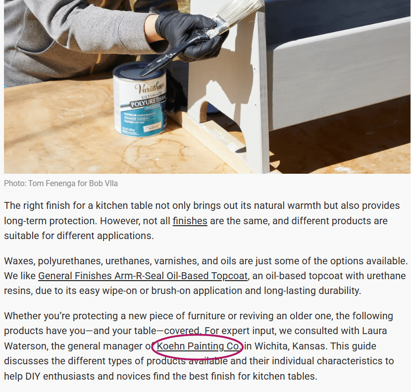 This fall, Koehn Painting was featured in Bob Vila, one of the most trusted names in home improvement. Their team turned to our general manager, Laura Waterson, for expert advice on kitchen table finishes.